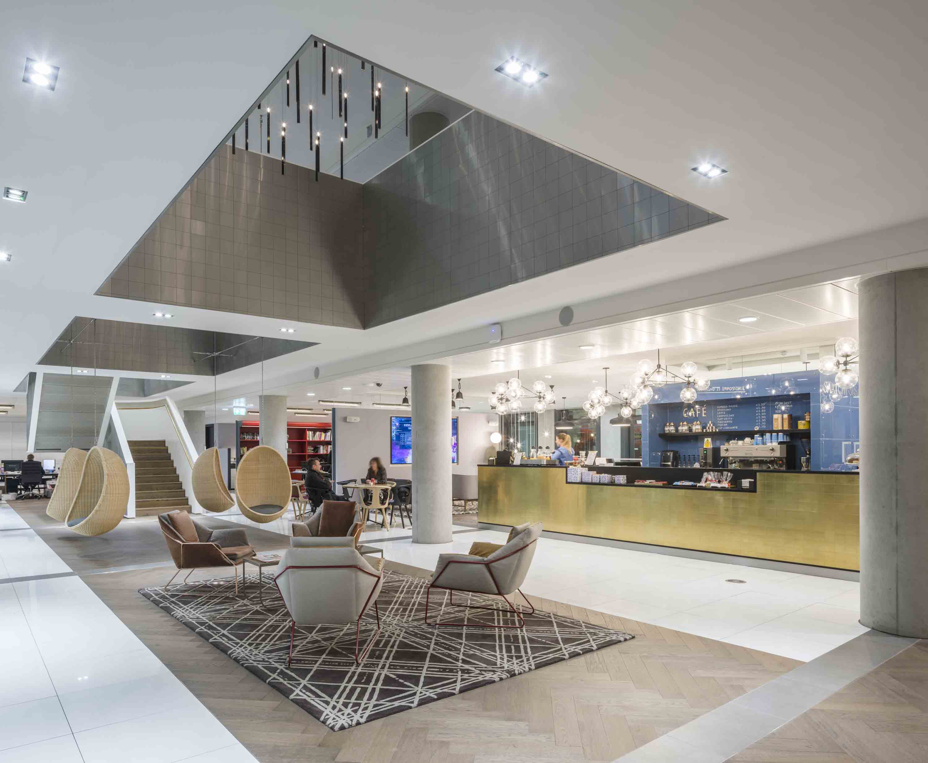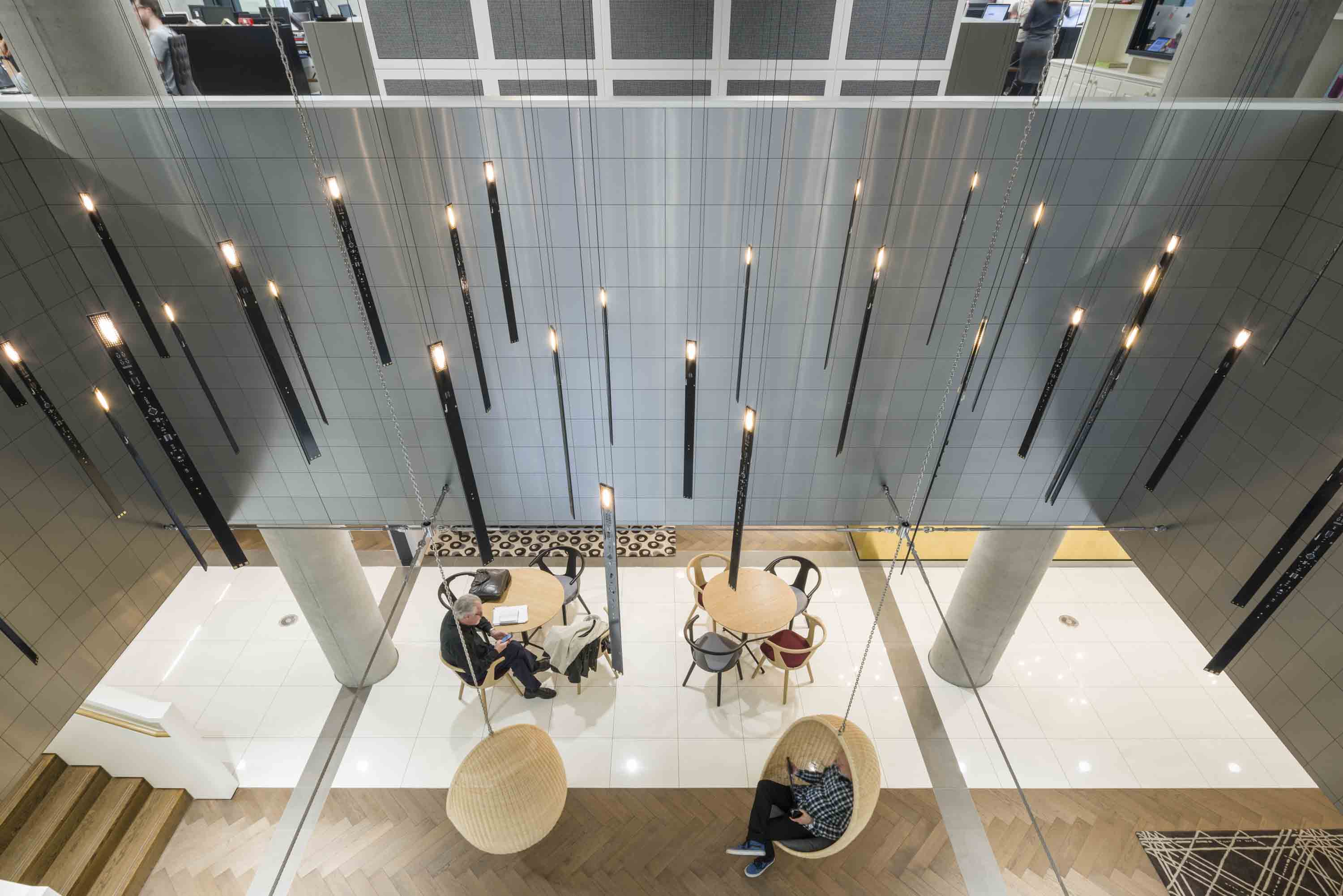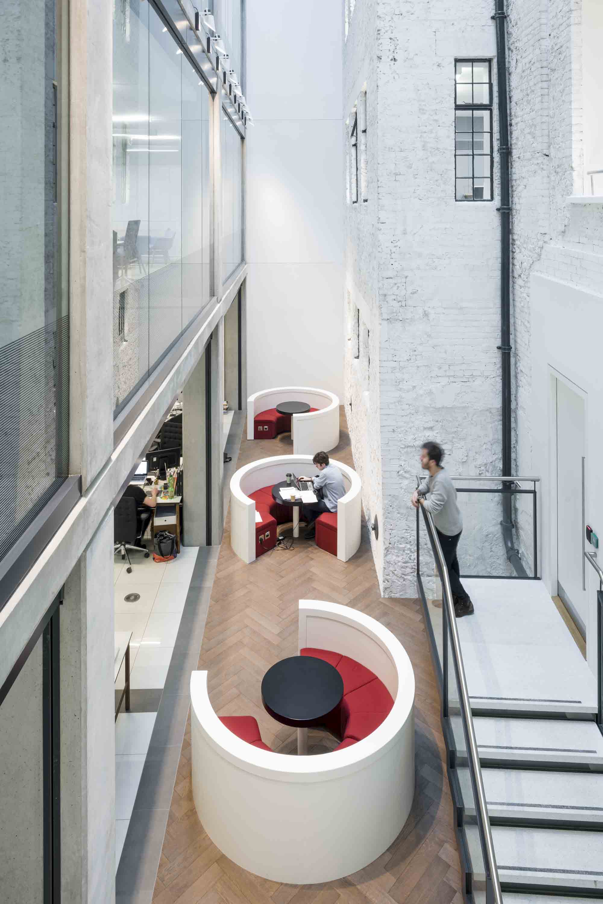 Inside, a traditional ground floor reception area has been dispensed with in favour of an open plan social hub that enables visitors to mix with employees as soon as they arrive and gain immediate insight to the philosophy of Saatchi & Saatchi and its creative approach.